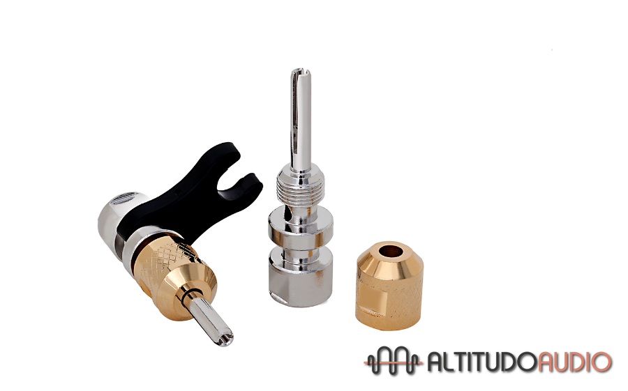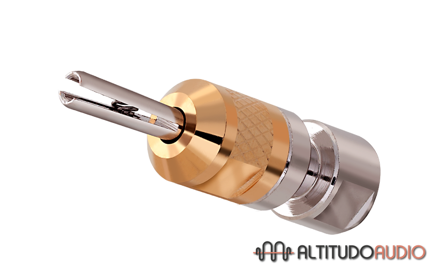 Gold binding nut for attaching spades or bare wire. Tapered hole at the back for soldering wire or stacking additional banana plugs. Spring loaded split tip for maxi- mum contact surface area and retention.