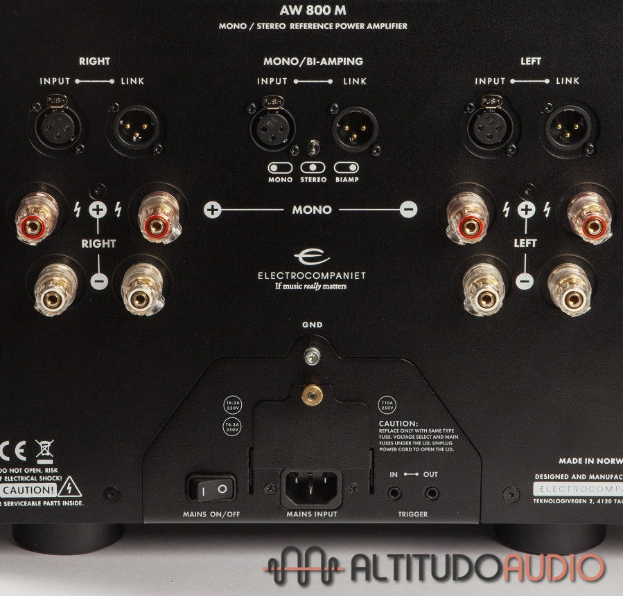 An intriguing new attribute of the AW 800 M is the ability to switch between mono, stereo and bi-amping operating modes, enabling you to upgrade your system or change your configuration while retaining your initial investment. Comfort upgrades are on/off switchable auto power down and switchable feature lighting, user switchable 115/230V mains voltage input as well as trigger input - ouput.