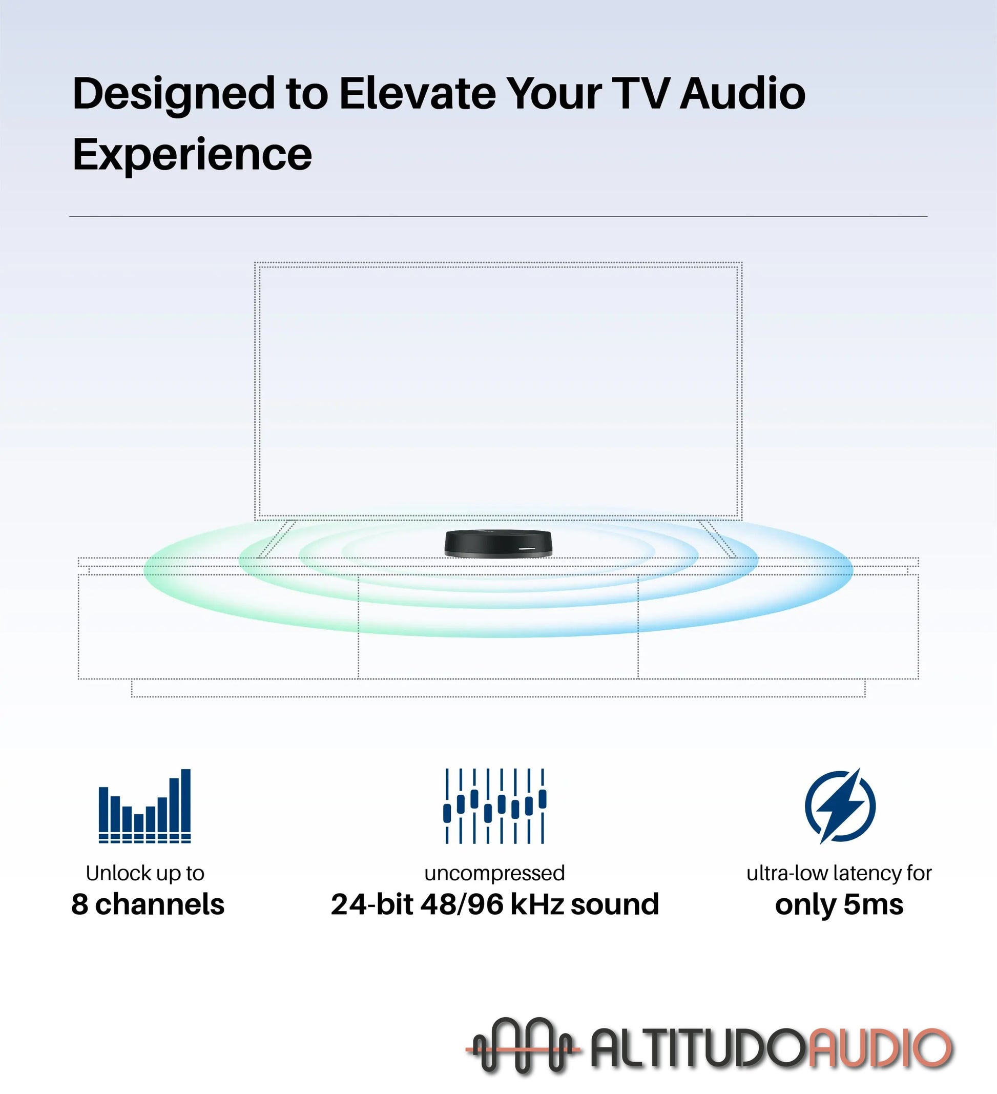 - Small size - hides behind TV. Convert your TVās audio signal into ultra high-quality sound and transmit it to WiSA-certified speakers with picture-perfect synchronization.