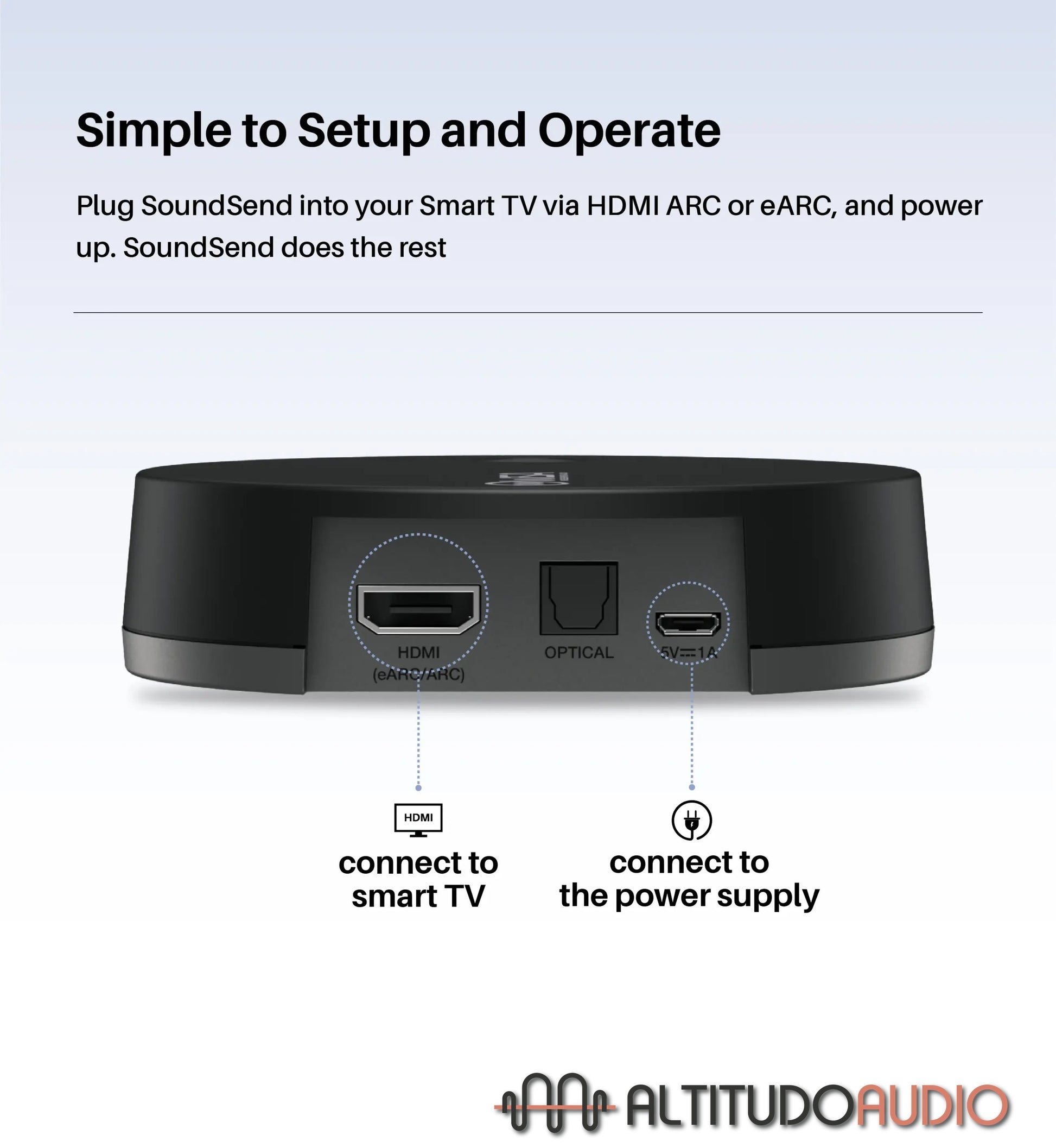 - Simple to set up and operate. Plug SoundSend into your Smart TV via HDMI ARC or eARC, and power up. SoundSend does the rest.Ā