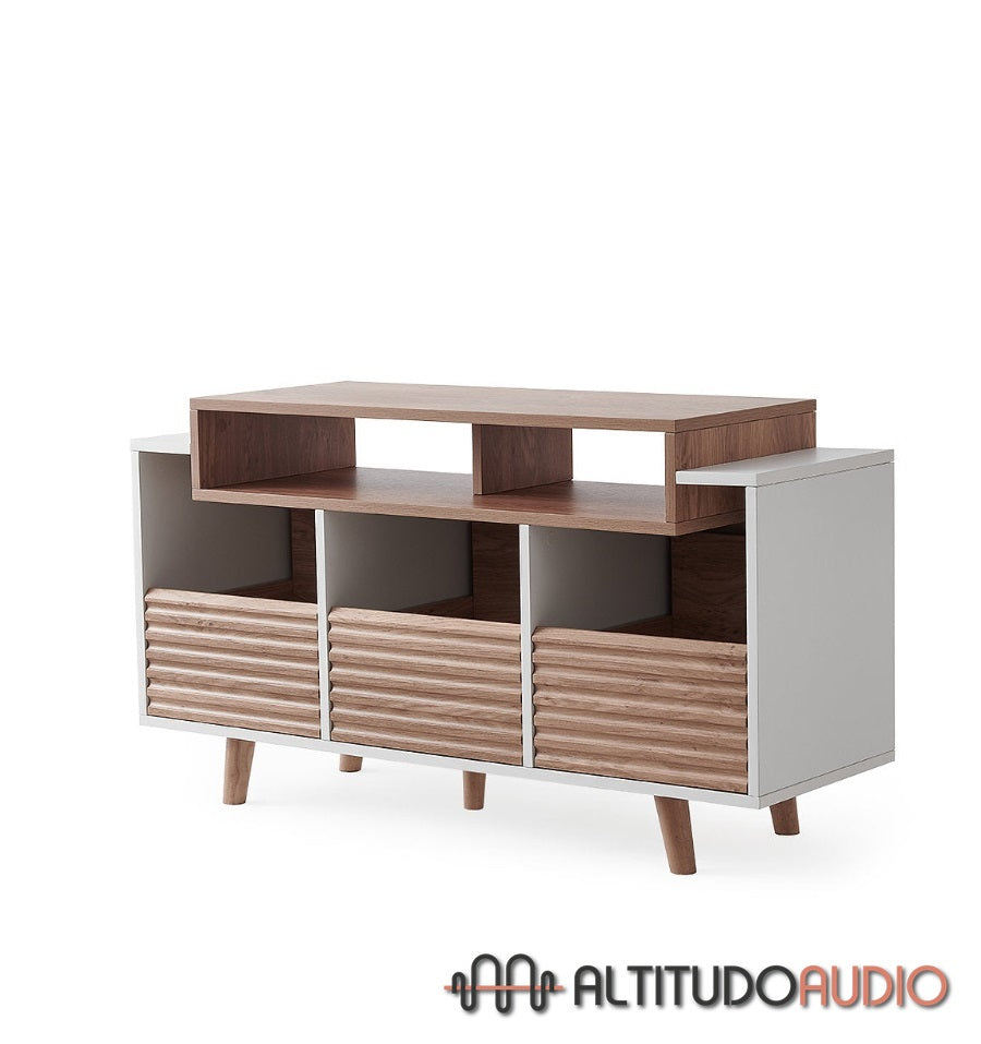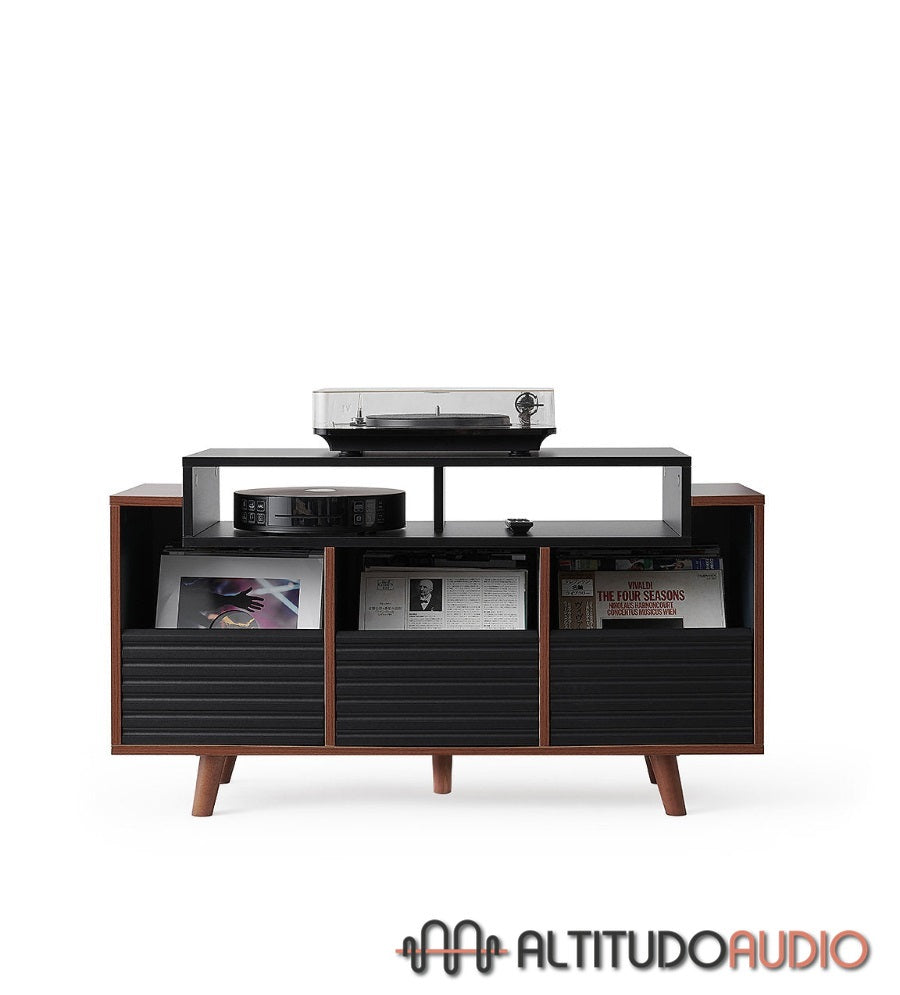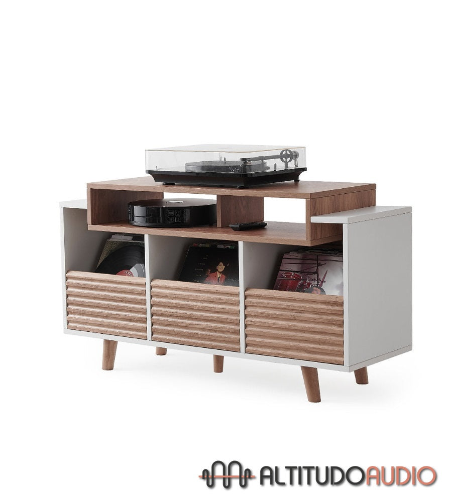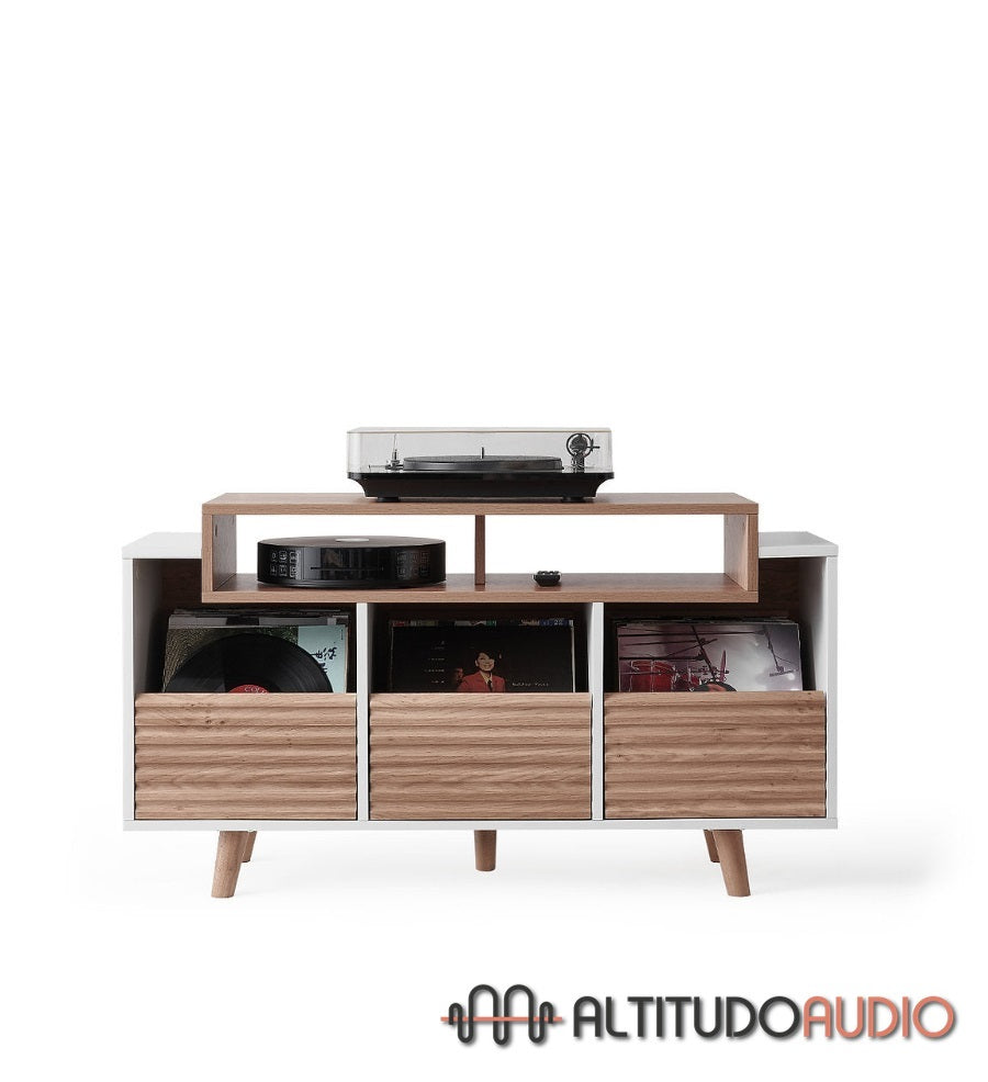 Available in two finishes - Black / Walnut and White / Light Oak - it blends perfectly into any interior, adding a contemporary and elegant touch. This model has three drawers, each with space for up to 80 vinyl records. The drawers feature an innovative grip system that prevents vinyl from slipping out, providing secure and practical organization.