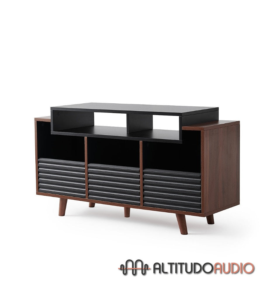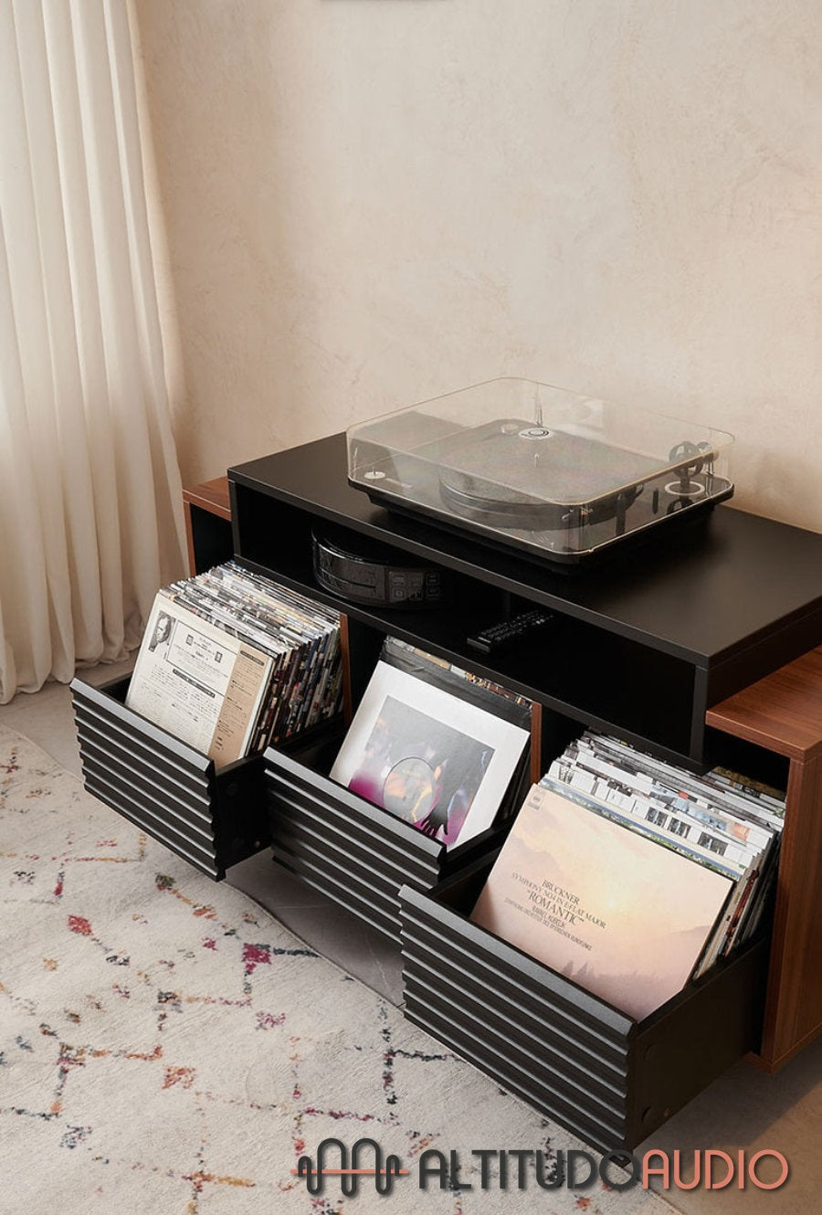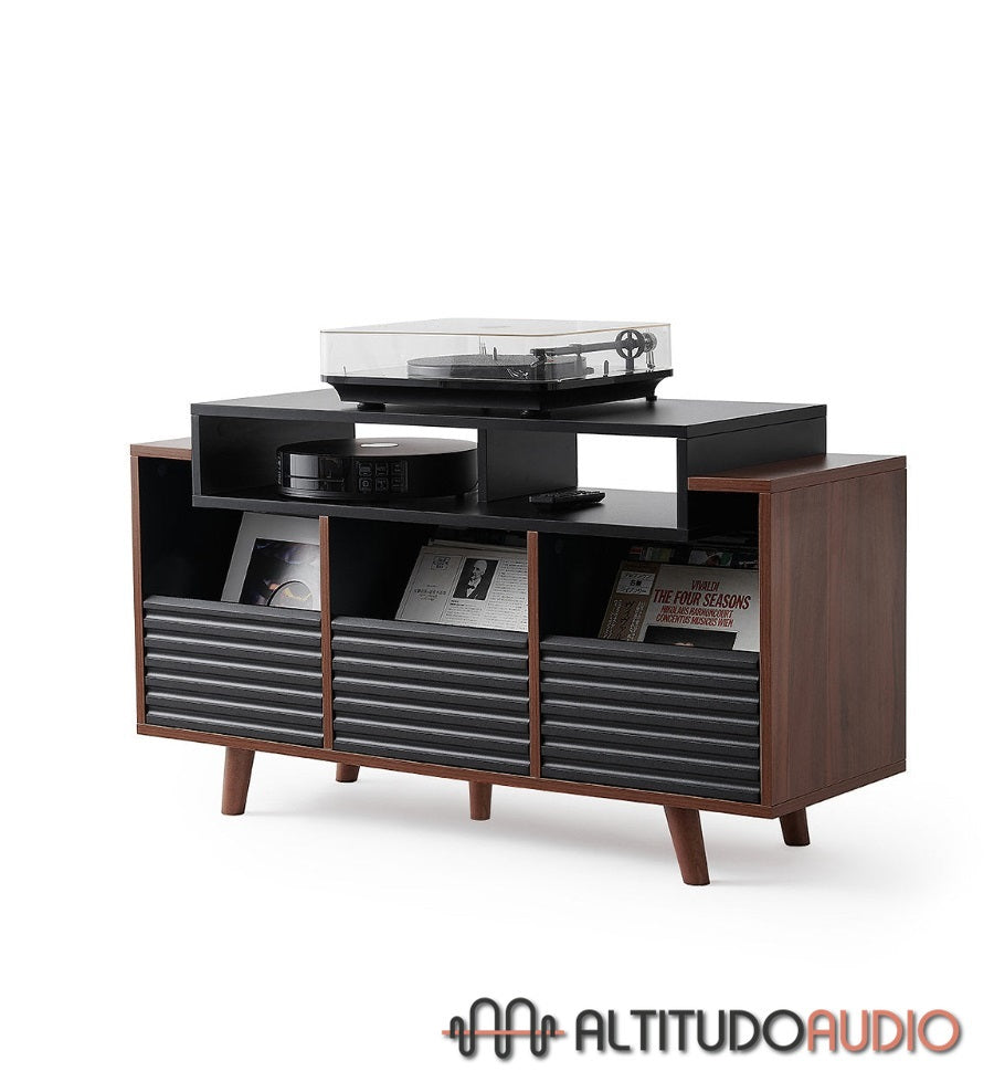 Available in two finishes - Black / Walnut and White / Light Oak - it blends perfectly into any interior, adding a contemporary and elegant touch. This model has three drawers, each with space for up to 80 vinyl records. The drawers feature an innovative grip system that prevents vinyl from slipping out, providing secure and practical organization.