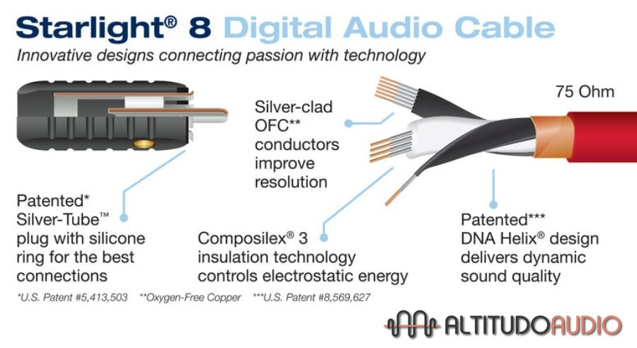 A smaller version of the ultimate DNA HELIX design used in Wireworld’s reference digital cables, the Wireworld Starlight 8 coaxial audio cable preserves delicate musical details, image focus and dynamic expression that is lost by conventional coaxial digital cables. It also reduces listener fatigue by replacing digital ‘glare’ with the natural tone qualities of instruments and voices. Starlight 8 is the only digital audio cable to offer leading-edge technology, materials and performance, in the price range of conventional coaxial digital audio cables. The patented DNA HELIX design and COMPOSILEX 3 insulation provide clear improvements in musical detail and dynamic expression. Available in RCA to RCA termination, as well as RCA to BNC, BNC to BNC and BNC to RCA.