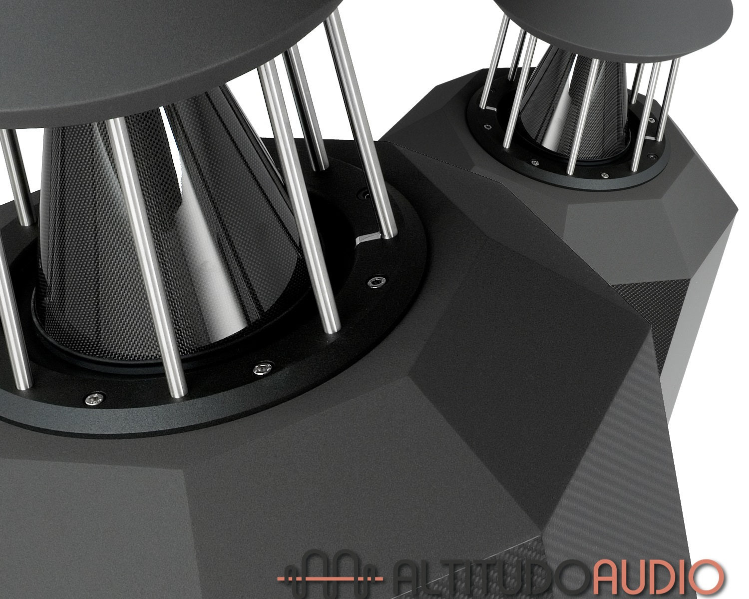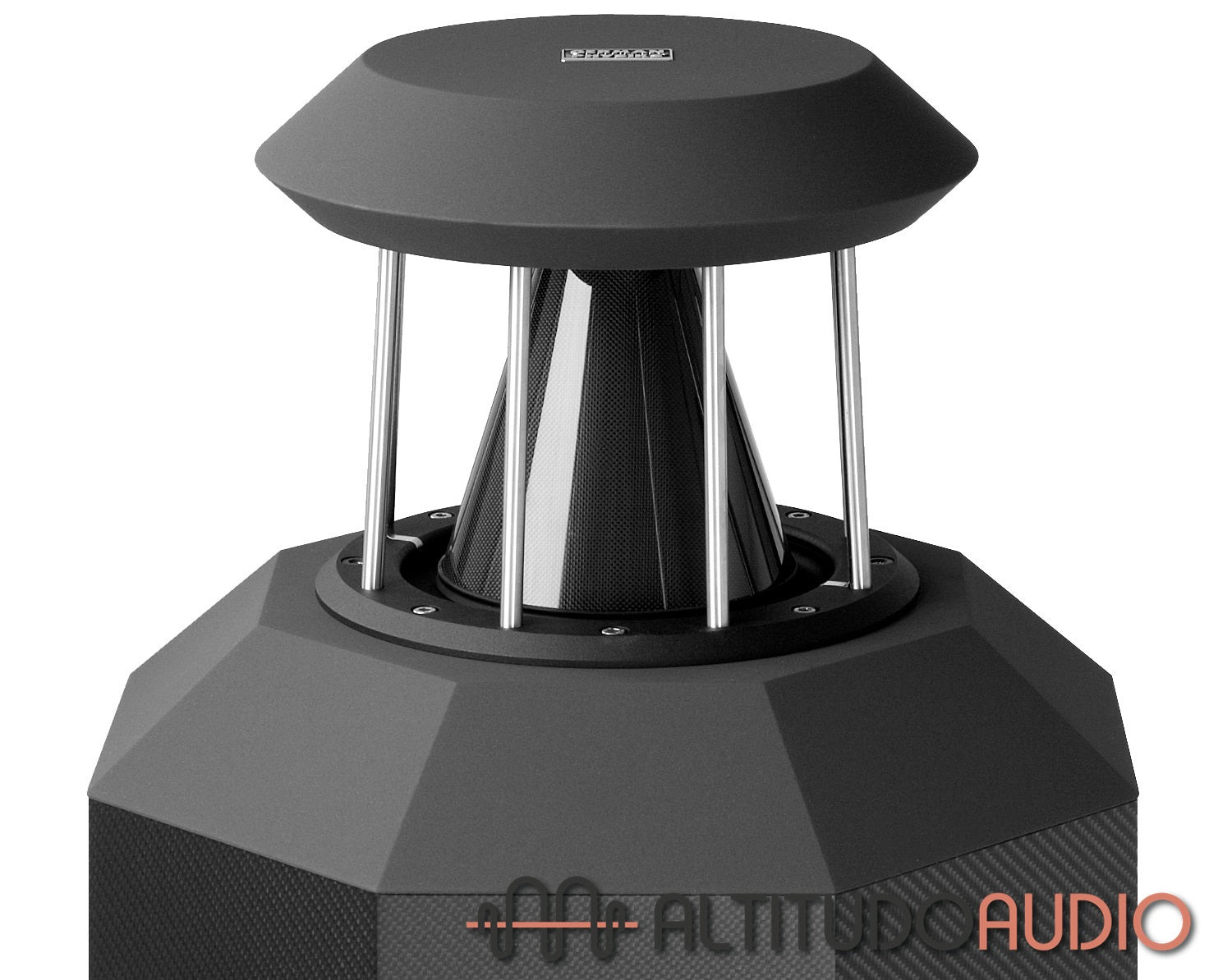 The Carbon MK IV loudspeaker uses a single carbon fibre German Physiks DDD driver mounted on top of a slim, octagonal, floor standing cabinet, with a downward firing 12-inch woofer set in its base