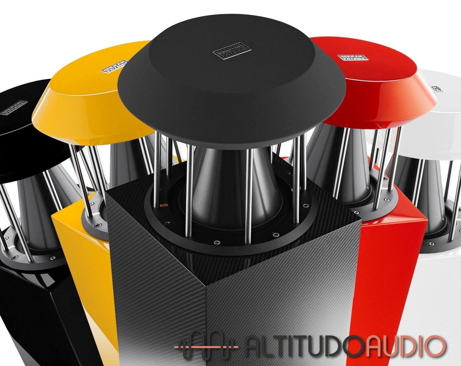 The Unlimited Ultimate loudspeaker is finished in high polish polyester black, white, red and yellow and the Unlimited Carbon is finished in high polish carbon fibre.