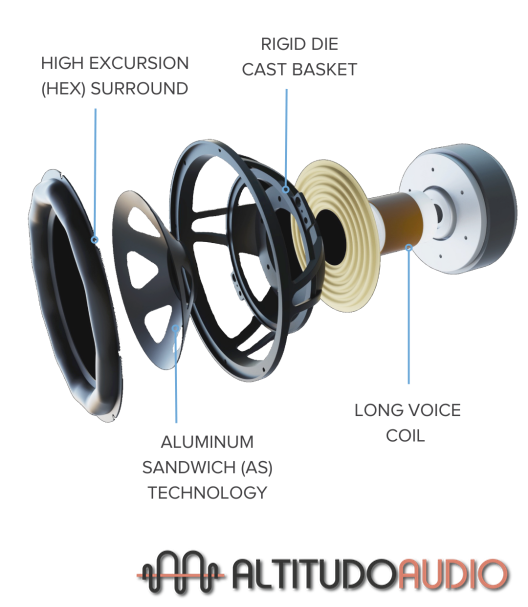 Aluminum sandwich cone with a large 2.5” voice coil for increased power handling and thermal management, resulting in higher output and SPL.